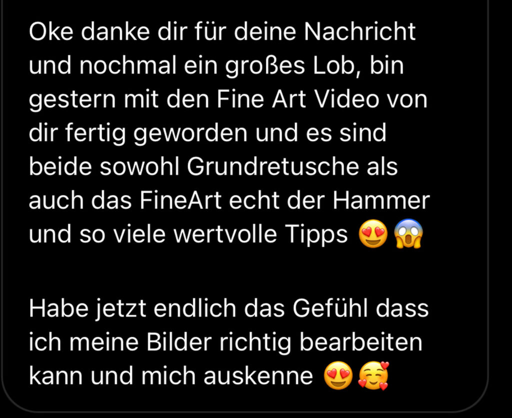 Dann schau dir dieses video an, in dem ich ein wenig mehr darüber erzähle, welcher Bearbeitungsworkflow sich mehr auf einen Bereich in der Bearbeitung konzentriert und natürlich auf welchen. Denn jedes Bild hat andere Anforderungen und braucht unterschiedliche Techniken.